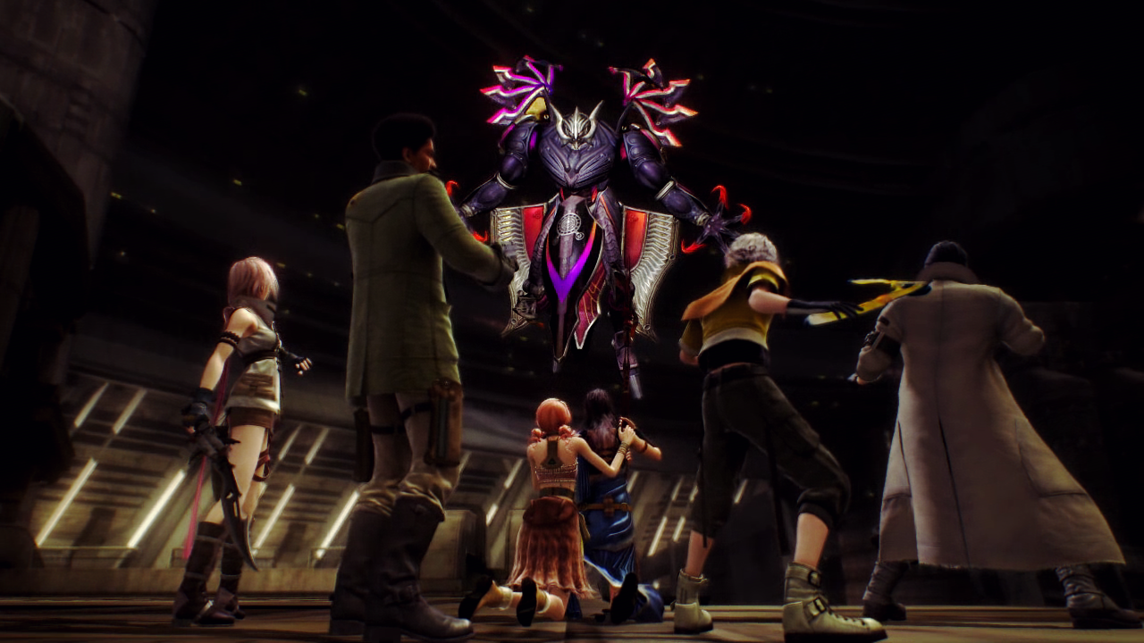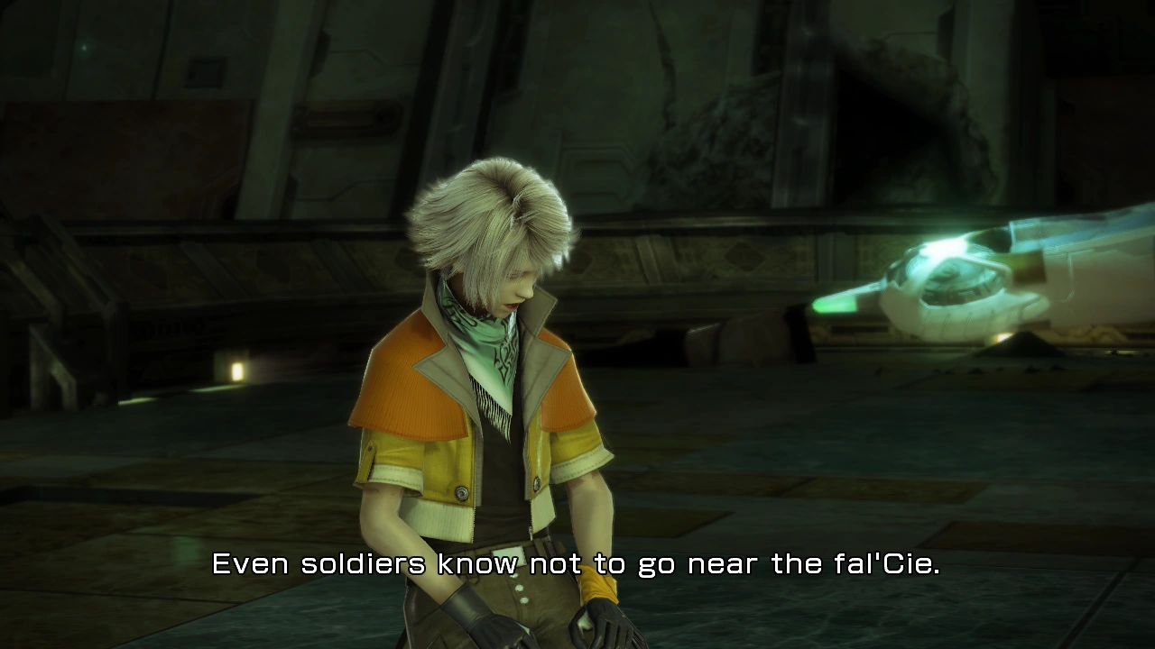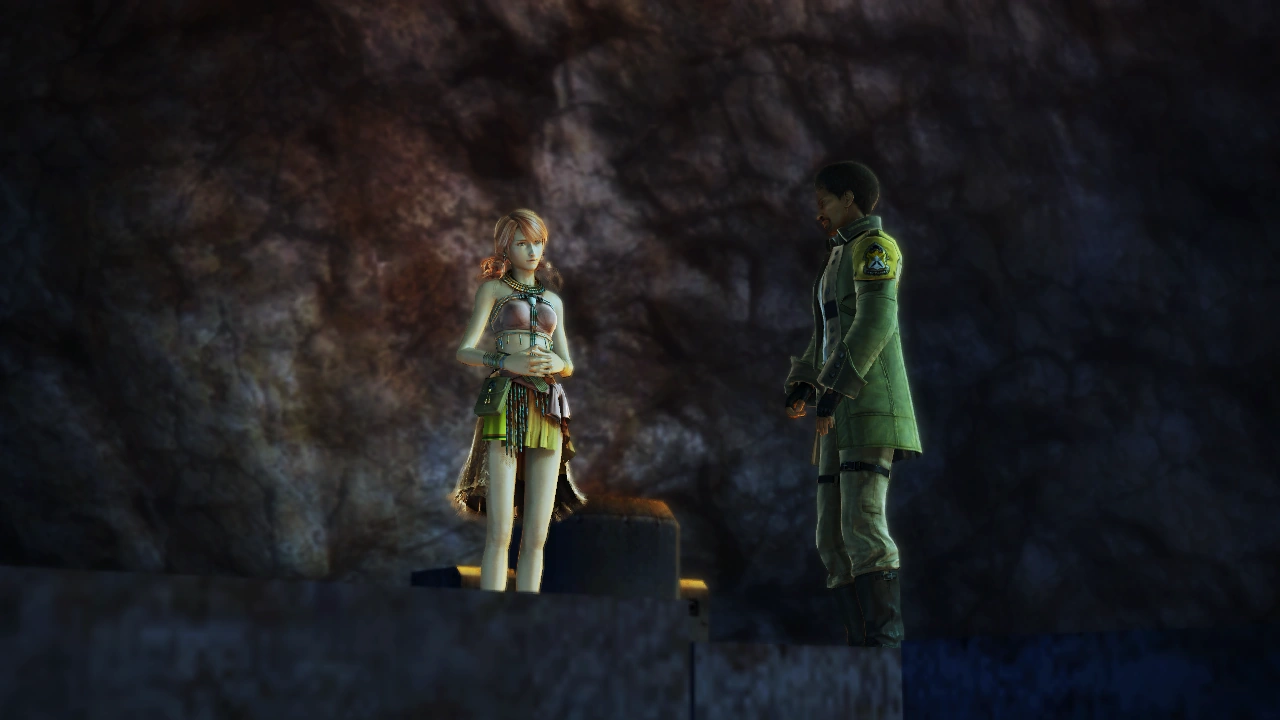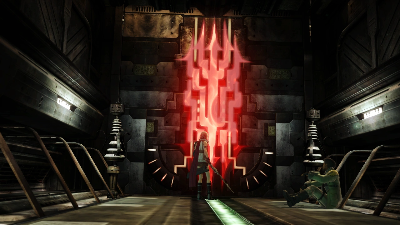 Military 'weapons' stalk the halls of the Vestige. Though the PSICOM recon team that uncovered the lowerworld being two days previous is still trapped inside, Lightning and Sazh know that the real threat is not part of the Sanctum army, but the Pulse fal'Cie and its servant l'Cie.