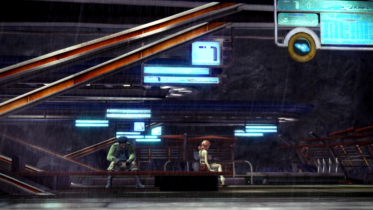 Lightning and Sazh are held aboard a military 'Purge' train along with a group of civilians destined for exile. In a stark contrast to the uncertain and despairing people around her, Lightning appears determined and focused.