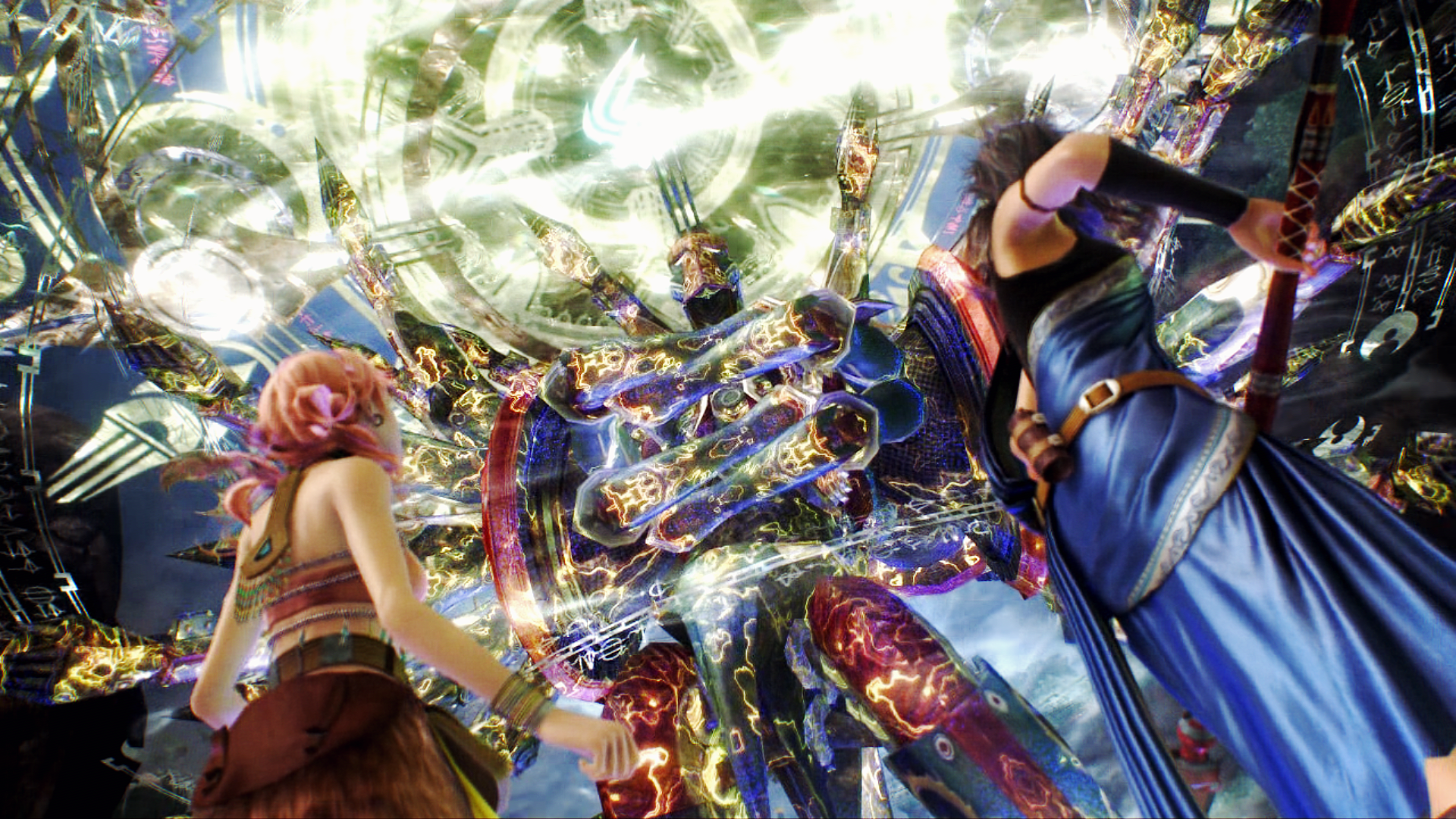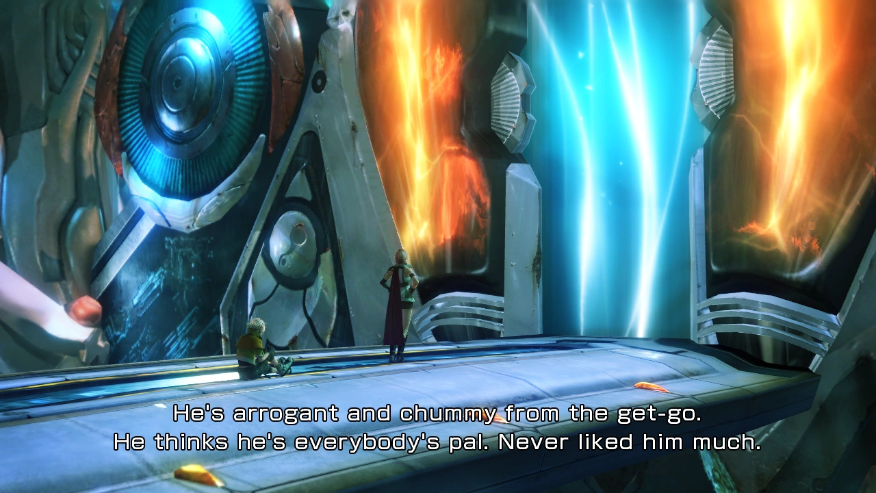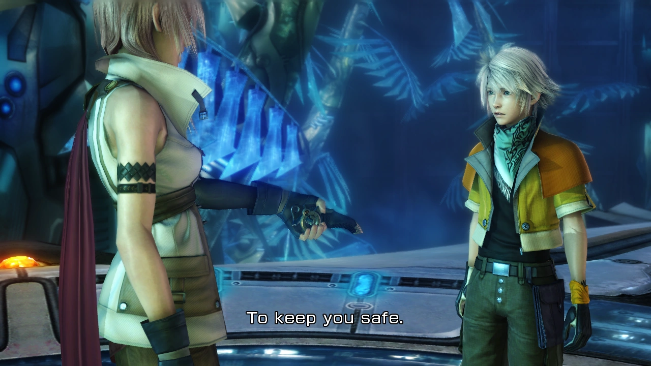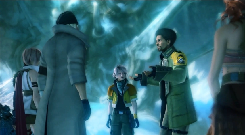 In his single-minded pursuit of Snow, he has rushed into the lair of a fal'Cie and is only now recalling the terrible nature of the being that lurks within. The Pulse entity could use its power to curse them—to turn them into l'Cie.