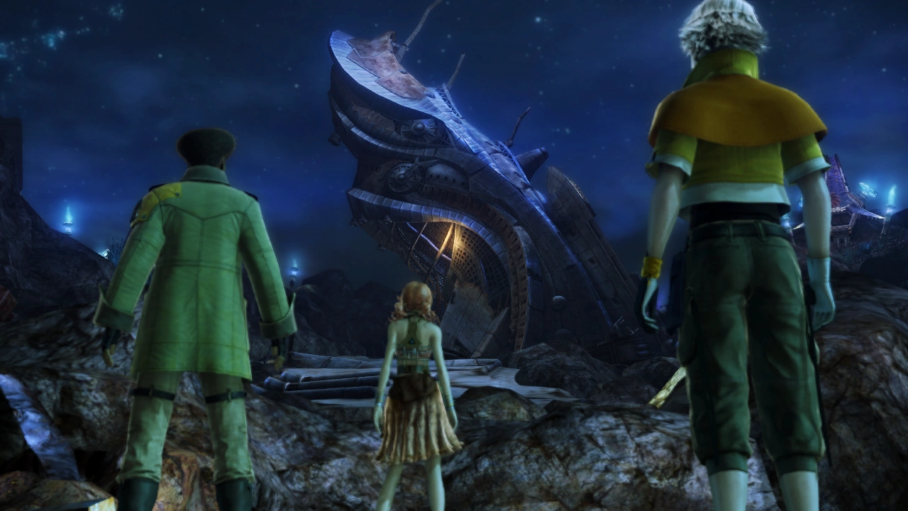 A massive object is transported through the sky over the Hanging Edge. This object is a Pulse Vestige — a lowerworld artifact that had been nothing more than a Bodhum landmark. Two days ago, it was discovered that the Vestige housed a long dormant Pulse fal'Cie.