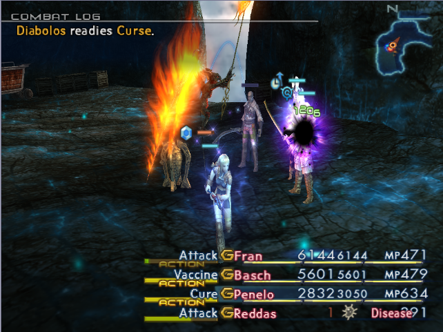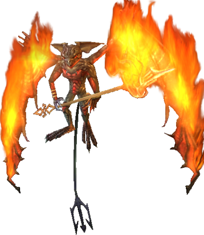When in critical health Diabolos will use Force Barrier, which negates physical attacks. During this period, Diabolos will use Pyromania, which inflicts high Fire-elemental damage upon all characters in range. It will also use Curse, which inflicts Confuse, Disease, Poison, and Sap on all targets in range.
