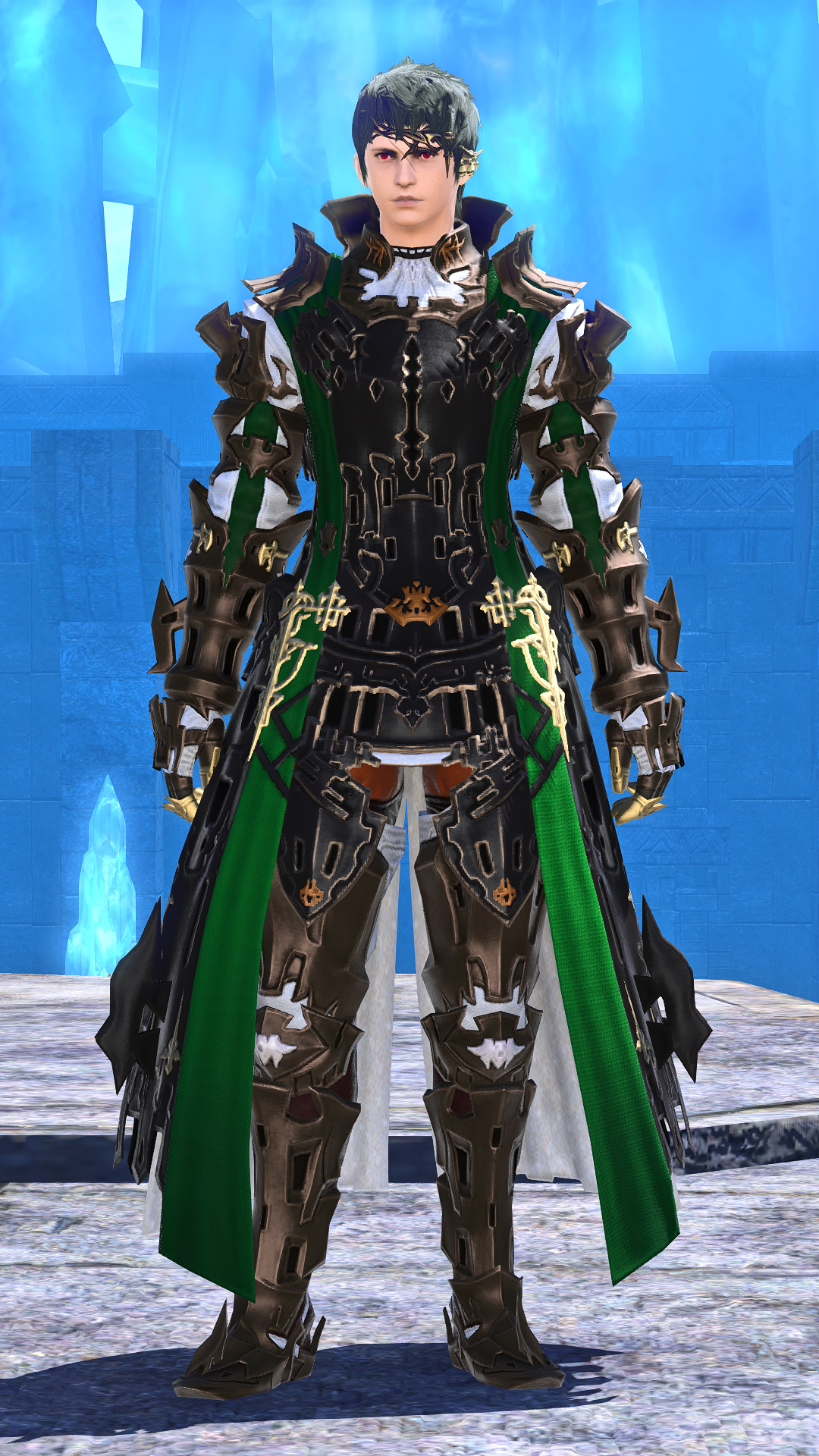 Doga is a midlander hyur man with dark brown hair and the red eyes seen in Allagan royalty. He wears a palette-swapped version of the Heavy High Allagan Coat.