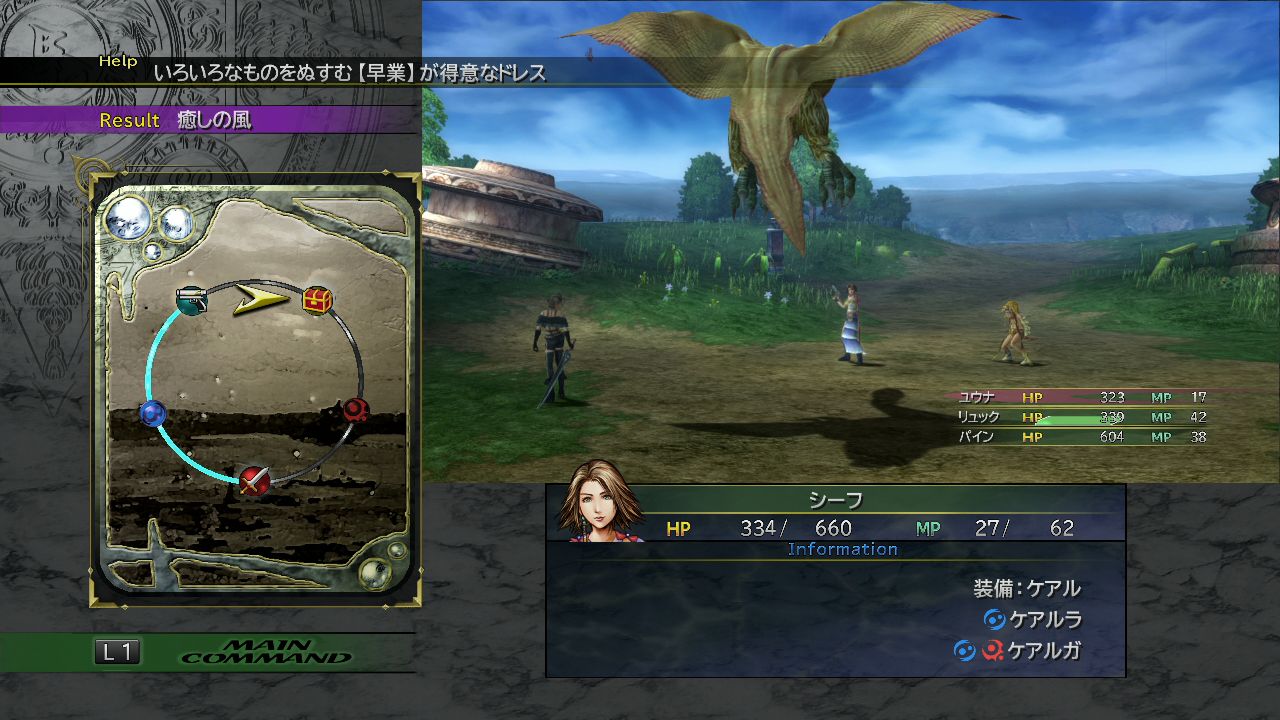 Each animal accepts different commands and performs different abilities. This is similar to releasing monsters in Final Fantasy V, except the monsters are permanent. To obtain the dressphere, Yuna must correctly respond to Kimahri in Chapter 2. He will give the dressphere to the party in Chapter 3 when Garik Ronso is planning to attack the Guado. If Yuna rests at the Celsius cabin at least once every chapter, in Chapter 5 a scene will occur and the player can rename the animals by talking to Barkeep.