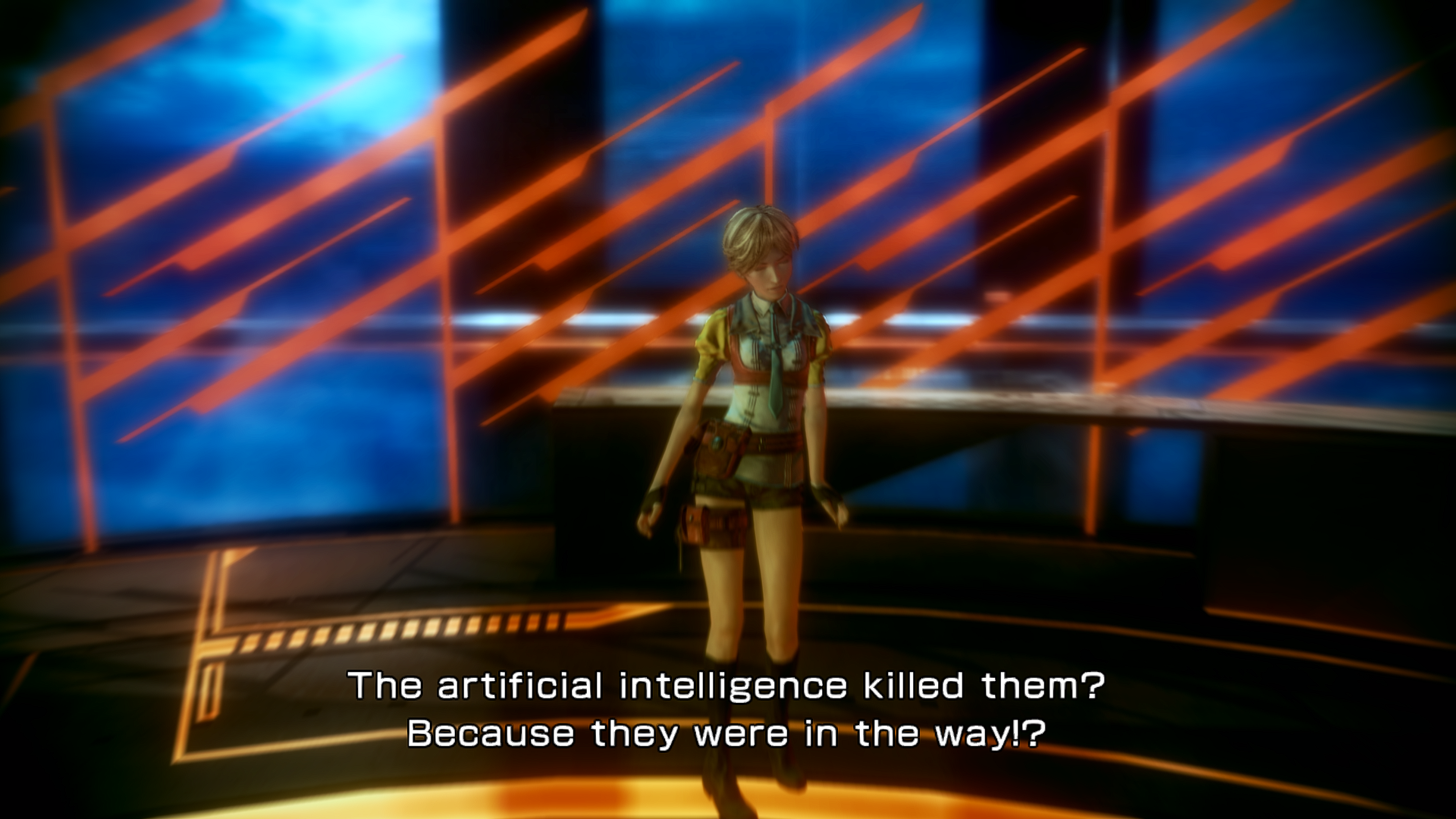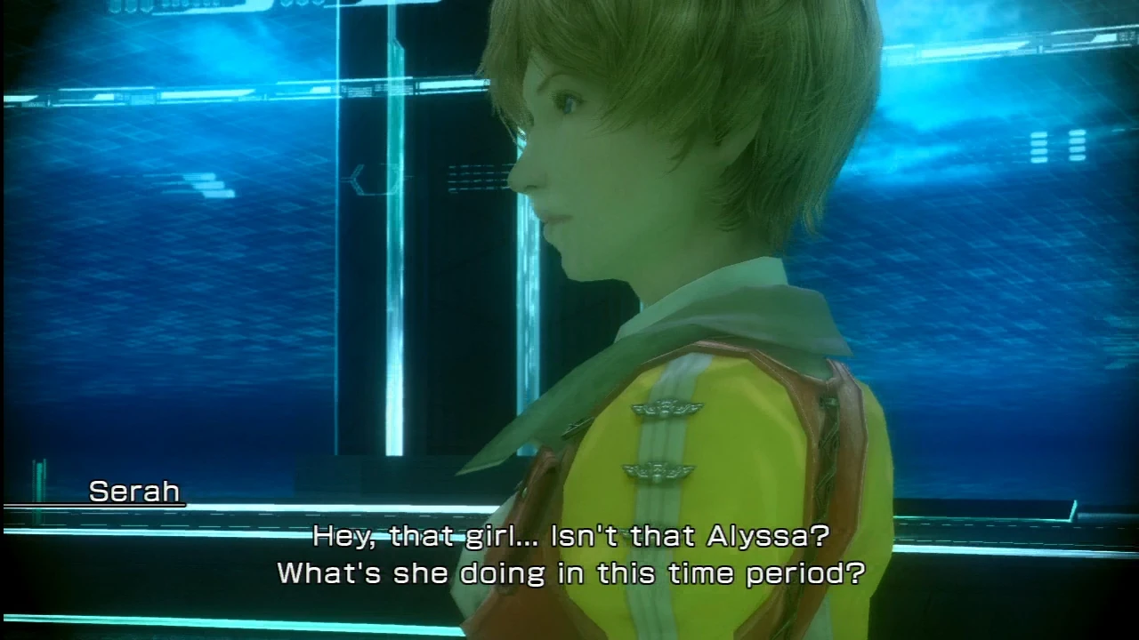 While riding the elevator with Alyssa's duplicate, Noel and Serah enter a paradox and witness scenes from 187 years ago where Hope Estheim and the original Alyssa were murdered by the tower's artificial intelligence. After having taken control of the Academy the artificial intelligence wiped out the humans and created duplicates of the people involved to hide the event. This is the "forbidden history".