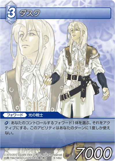 Dusk is secluded from the Warriors of Light. Most of the time, he is silent and reserved. During many of the early scenes, he shows off his profound side. He is gentle, serene, sophisticated and shy. When he was younger, he offended Sophia by calling her "Gaunt girl" and was struck by her Thunder spell as a punishment.