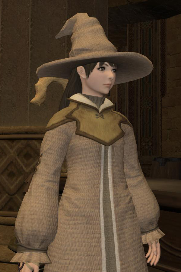 Edda is a Midlander Hyur with dark brown hair and brown eyes, dressing in a brown cotton robe and a brown pointy hat. Her weapon is a two-handed conjurer cane. Later in the story, Edda reappears with a new set of clothes, the Pilgrim set. In the Palace of the Dead, she wears a black gothic dress, a black pointy hat adorned with flowers, boots, and an eye patch. She also wields a silver scythe.