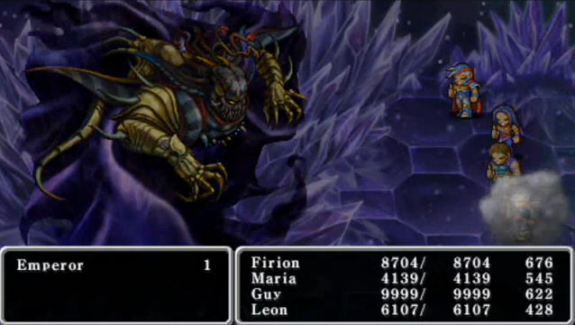 The Emperor is powerful and attacks relentlessly, similar to the Light Emperor. His physical attacks bear the same drain effect that Astaroth had, meaning every hit he lands will replenish his HP. He will attempt to inflict a handful of status effects on the party to hamper their attack, including Blind, Slow, and Curse. His offensive magic arsenal includes the powerful Flare XVI and Starfall X, which hits the whole party. The Emperor resists all elemental attack magic and absorbs all status ailments.