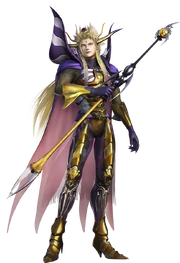 His Dissidia appearance gives him a scepter with a circular disc with curved spikes on top and two prongs at the center. With the exception of his Arubboth costume, the primary colors of the staff match with the color of his armor. He wields a similar staff in the NES/PR versions of Final Fantasy II.