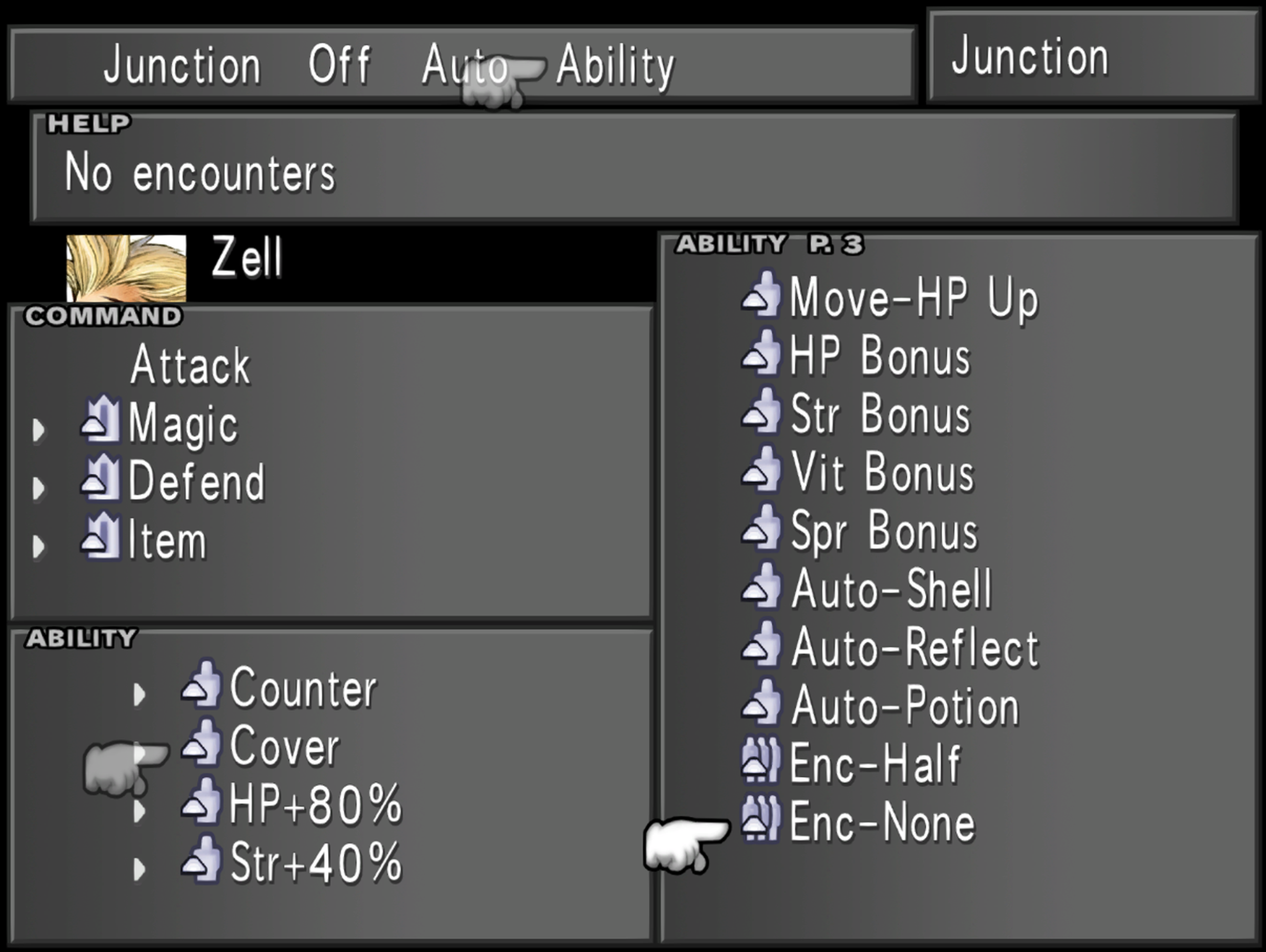 Enc-None is good whenever the player wants to avoid fighting, such as for any segments with time limits: Centra Ruins, Esthar City during Lunatic Pandora's attack, and when awakening Omega Weapon in the final dungeon.