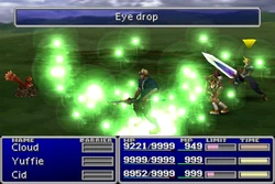 Eye drop is a recovery item item in Final Fantasy VII that cures Darkness from one target, an ailment that makes them miss their attacks often.