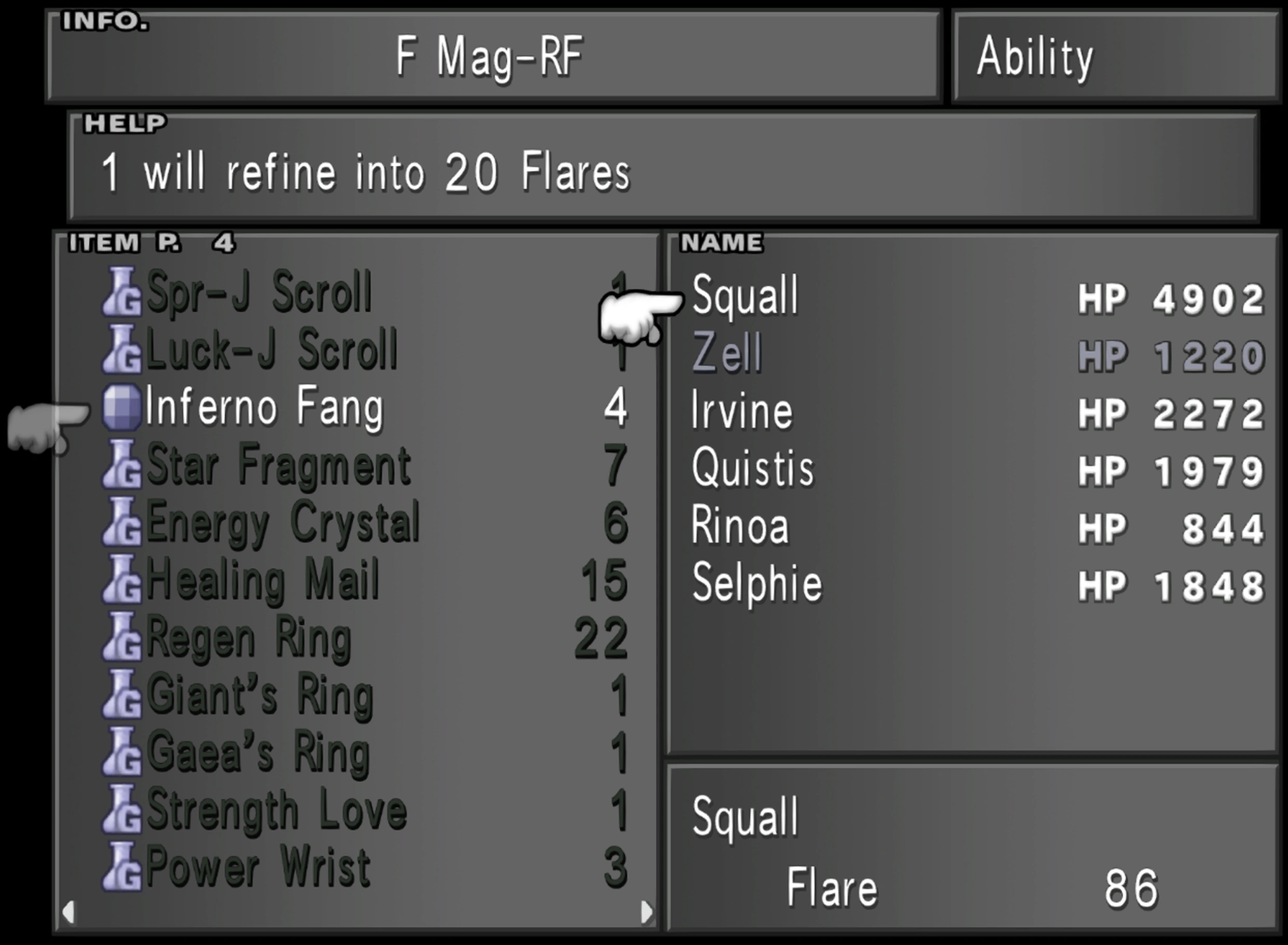 Using F Mag-RF in the Ability menu enables the player to make spells from items currently in their possession and allocate the resultant spells to a party member who has space in their Magic inventory. Each party member has 32 slots for Magic, and can hold 100 spells of each type.