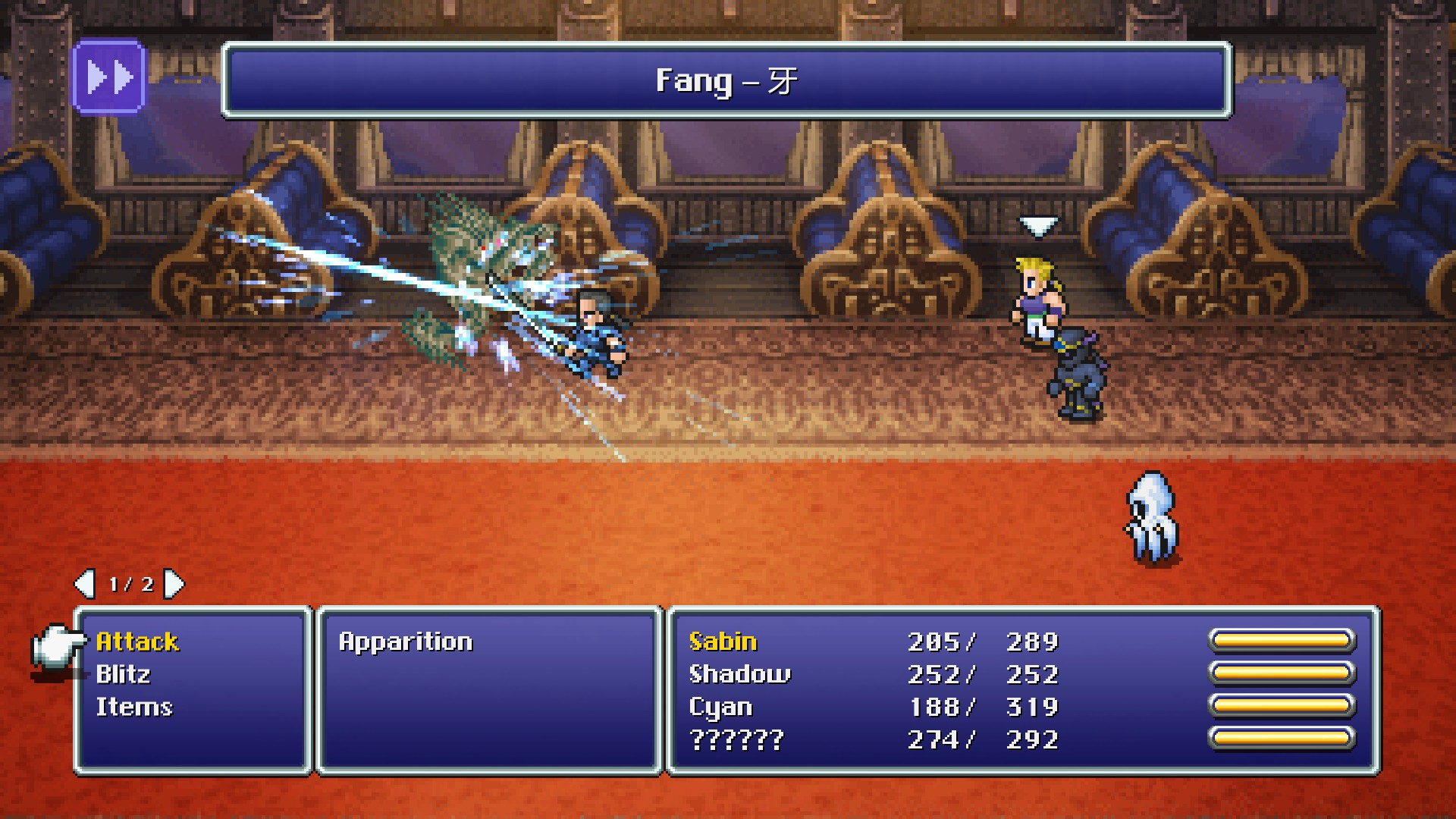 Fang, also known as Dispatch,[1][2] is Cyan's level 1 Bushido technique in Final Fantasy VI. It requires only one charge, and deals physical damage to one opponent that ignores Defense, making it a basic yet strong attack.