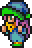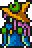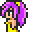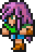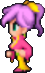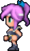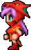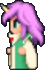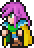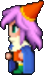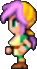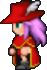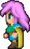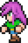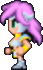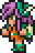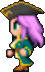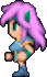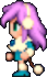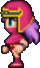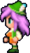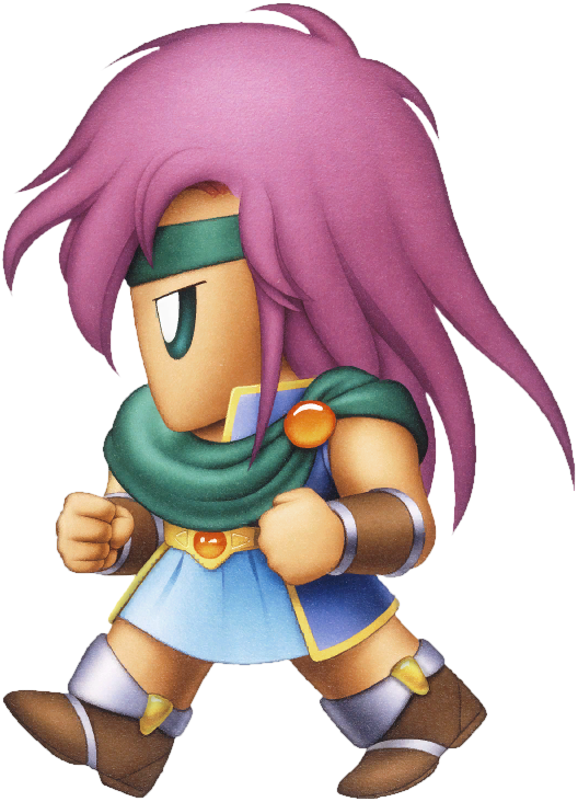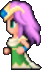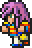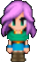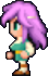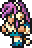 Faris has two distinct appearances: the in-game sprite and the artwork design. The in-game Faris has long, loose purple hair with a green headband and green eyes. She wears a dark blue sleeveless jacket with gold piping and a paler blue tunic with a gold belt that has a red jewel, similar to her sister's. Over the shoulders, Faris wears a baggy green shawl hiked up on the shoulders and secured with a red stone brooch. She has brown leather bracers on the forearms and matching boots.