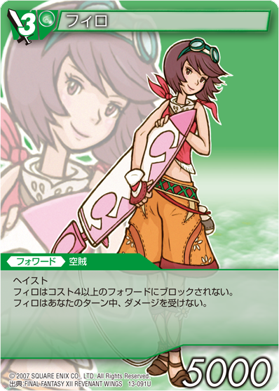 Filo appears in the trading card game with a wind-elemental card showcasing her official Final Fantasy XII: Revenant Wings artwork. She has the wind-element as she is a flying unit in Revenant Wings, utilizing a hover board.