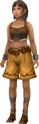 In Final Fantasy XII, Filo has silverish brown bobbed hair with evenly cut bangs divided more to the right. She wears a short-cropped caramel-cream fitting top with white laces, a pair of silver bangles, and out-spread caramel-cream baggy pants, along with a brown leather belt wrapped with dark brown straps. Gray straps which cover her shanks, and she wears a pair of tan sandal-like shoes with knee-high straps.