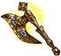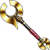 | ★★★★ - A golden axe that brings fortune to the righteous. An axe that grants a flux of spiritual energy to the righteous man or woman who wields it. Although it may appear to be a normal golden axe at first glance, its blade remains unusually intact. Legend also has it that it possesses such strength that it can cut down great trees with the slightest swing. Merchants revere the golden axe as a charm that brings good fortune, and thus many of their stores bear its image as a symbol of respectable business. | ||||||
