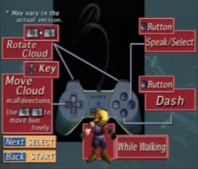 The battle and field models have slight differences. The characters' eyes are black ovals instead of the more life-like eyes seen in the game. Cloud's menu portrait uses the young Cloud portrait, as seen during the Kalm flashback to the Nibelheim Incident in the final game. Aeris's menu portrait has a more serious expression than in the final game.