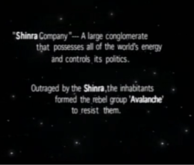 - "Shinra Company" --- A large conglomerate that possesses all of the world's energy and controls its politics.