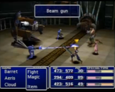 The Attack command is called "Fight", the same as it was called in the previous installments in the series. The Limit Break command is called "Special", despite still being called "LIMIT BREAK" in the demo's Japanese version. Aeris can only use the Healing wind special technique, and Barret can only use Heavy shot, the demo's name for Big Shot. Cloud has access to both Braver and Cross Slash, however, they function differently to the full game, as Braver temporarily paralyzes an enemy, and Cross Slash does not—the opposite to the full game.