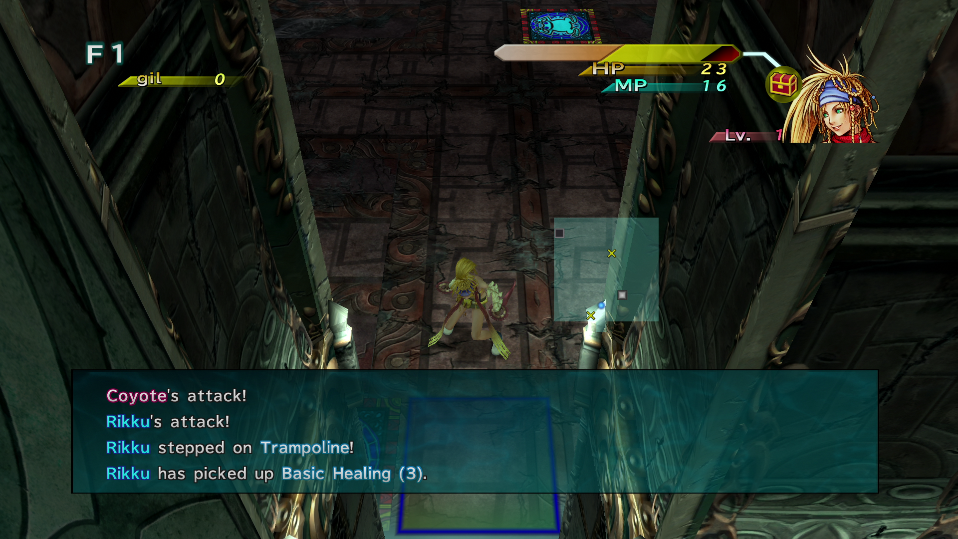 In most rooms, the player finds various items, such as dresspheres, gil, medicine or folios. The player can use most medicine to heal status ailments or cause other beneficial effects, while some inflict status ailments instead. Folios heal the character and have various other effects. Gil can be used to purchase items in shops that can appear between floors. The player is limited to holding 20 items, including dresspheres. The floors have traps that have effects ranging from damage to inflicting negative statuses and even dropping the player one floor.