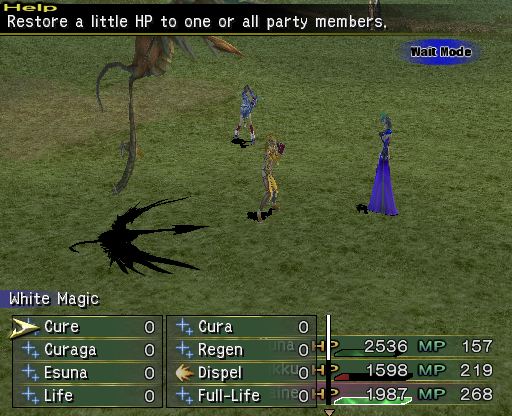 Regen restores 3% of the target's HP each turn. The player has various ways to bestow it to their party, such as with White Magic and Yuna's unique dresspheres. The player can also get Auto-Regen to permanently have the status or SOS Regen to initiate it when low on health.