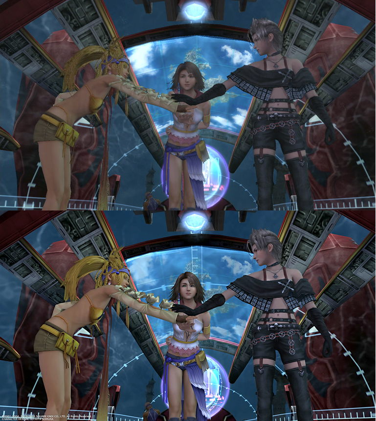 For both Final Fantasy X and Final Fantasy X-2, many of the character models are remade from the ground up, including all the controllable characters. The other characters and monsters had their textures rearranged to improve quality. For the 16:9 support, the camera was adjusted to have the visuals work in 3D scenes, but the pre-rendered background scenes required a lot of redrawing and adding on to get them to look correct. With the cut scenes, if the view was simply extended to 16:9, things like people on the sides waiting for their "cue" to enter, would become visible.[13]