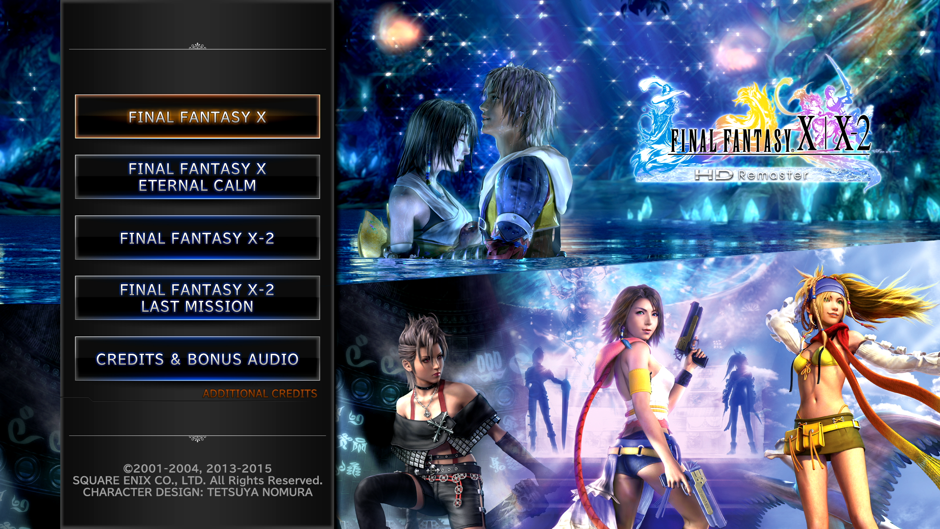 The PlayStation 3 version includes both Final Fantasy X and Final Fantasy X-2 and retailed for 7,140 yen for physical copy, and 6,400 yen for download. It includes: Final Fantasy X HD Remaster, Final Fantasy X: The Eternal Calm, Final Fantasy X-2 HD Remaster, Final Fantasy X-2: Last Mission and credits and bonus audio.