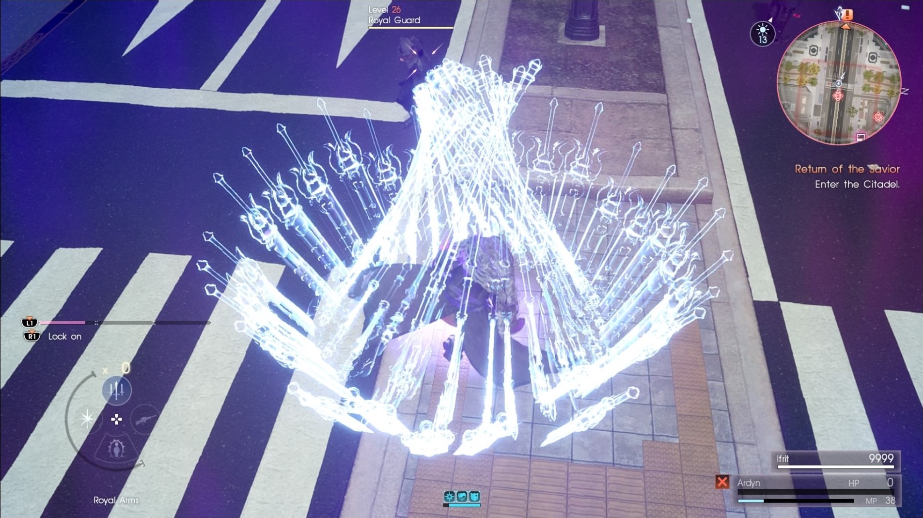 Ardyn has a technique bar, reserved for unleashing three different unique attacks from Ifrit. Doing this will summon Ifrit and allow him to attack alongside Ardyn in battle for roughly a minute, causing the arena to engulf in flames and the screen turn orange. Ifrit will phase in and out of battle to deal strong blows.