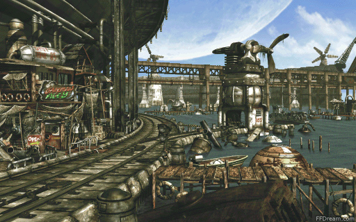 Fishermans Horizon was built by the dissatisfied engineers who were active during the time of Esthar's development and decided to abandon their homeland. The town was named by the man who had played an important role in breaking away from Esthar, the Master Fisherman. Those involved in the town's construction have grown old, but the town has reached the point of seeing its first native generation grow up. The town was built on the old railroad station used to cross the sea, and ruins of that structure still remain.