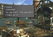 After having liberated the town from Galbadia, the party can witness the apprentice boy near the junk shop learn to fish properly, and he wants Squall to tell his master. On the way, Irvine will join Squall, and instead of returning to Garden, the two must return to Master Fisherman's fishing spot. He asks Squall to follow him to the local hotel, where he tells Squall and Irvine the town's history, then asks if they want to hear more.