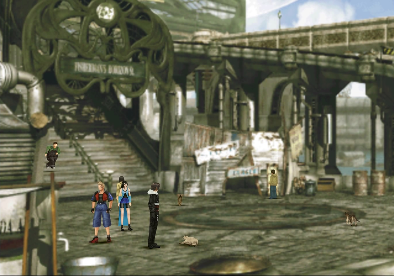 After defeating the Iron Clad on the station square, the player is meant to return to the Garden, but on the way Squall bumps into Irvine. If the player then heads back to FH, they can visit Grease Monkey for a scene and an item. When Irvine is deciding the instruments for the concert, the player can leave the scene and again visit Grease Monkey to get a scene and more items. After the player has done the stone-searching sidequest in Shumi Village and left and returned, they must get the artisan to help make a statue. Visiting the Grease Monkey at this point has him gift the party his Moomba Doll, which is needed to advance in the sidequest at Shumi Village.