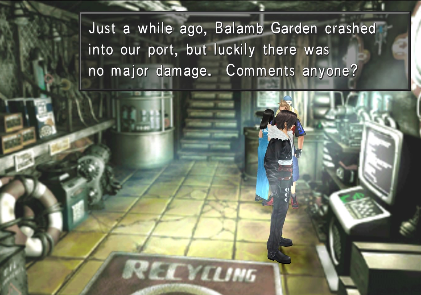 | First visit | Just a while ago, Balamb Garden crashed into our port, but luckily there was no major damage. Comments anyone? "I thought it was a bomb at first. It was so loud. I nearly fell down from the tremor." |