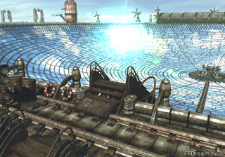 The sun panel is a round area in the shape of a dish, situated at the center of the town. It is thought to be the main power supplier for the settlement (it utilizes a concentrated solar power set-up, which was a recent technology around the time of the game's release). Bolstered by wind fans and possible water refineries, Fishermans Horizon boasts an immense power network. A long bridge cuts through the sun panel leading to the mayor's residence in the center. A draw and a save point can be found on its edge, and this is also where the Queen of Cards can be found if she comes to FH. The draw point fills fast and is a good way to stock up on Regen, as the player needs to walk around FH quite a lot if they want to do all sidequests here.