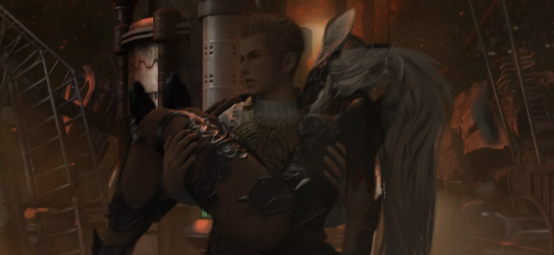 Fran carried by Balthier after she is injured in the Sky Fortress Bahamut.