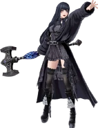 Guest artist Tetsuya Nomura oversaw Gaia's character design. She is visually a direct contrast to Ryne, having waist-length dark wavy hair and heavy makeup, with large features such as bright blue eyes and larger lips. Her outfit is gothic-inspired with an all black ensemble featuring a form-fitting gown with large, baggy sleeves and platform heel boots. Gaia's animations are based on the viis race, despite being a hume.