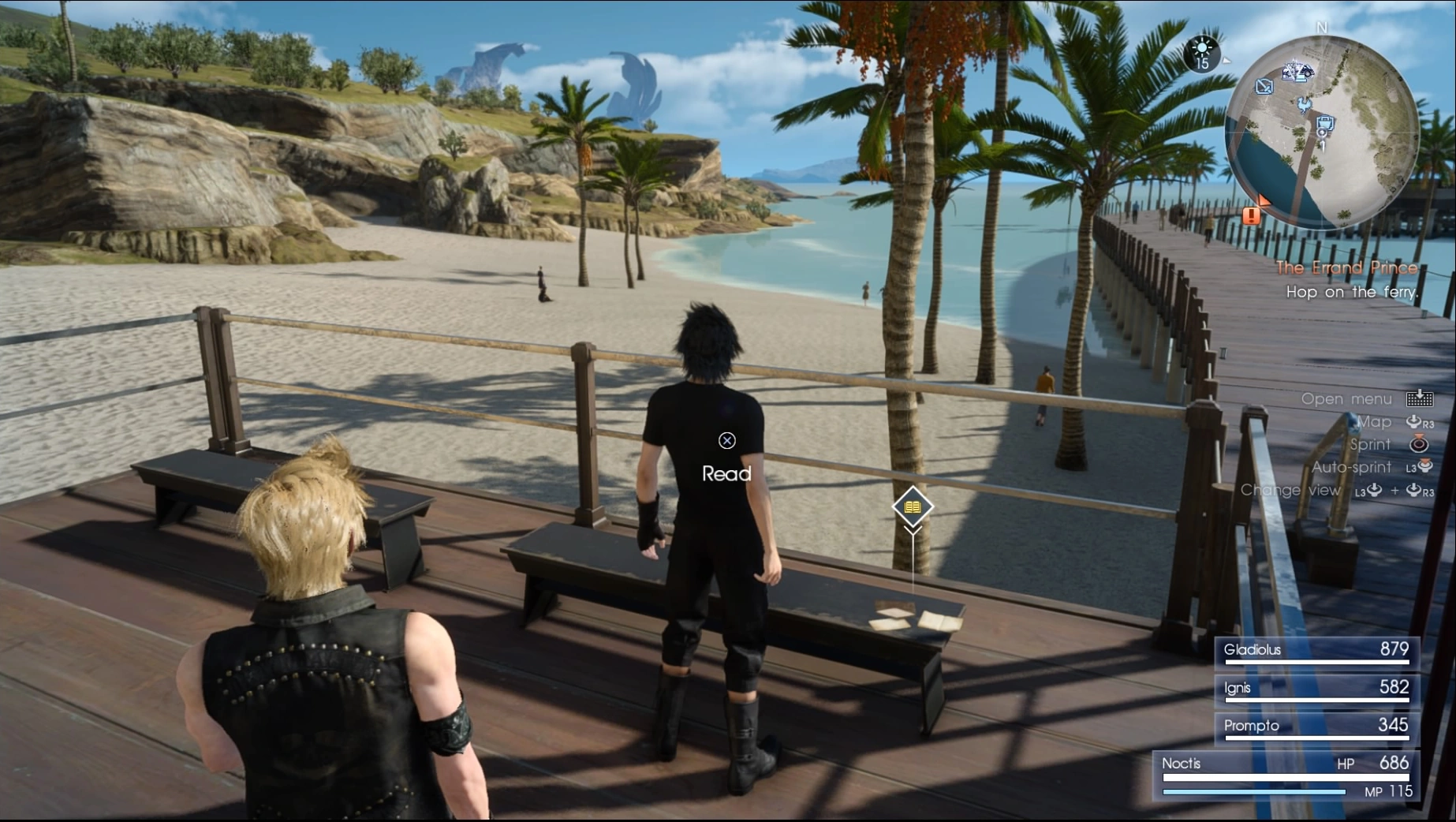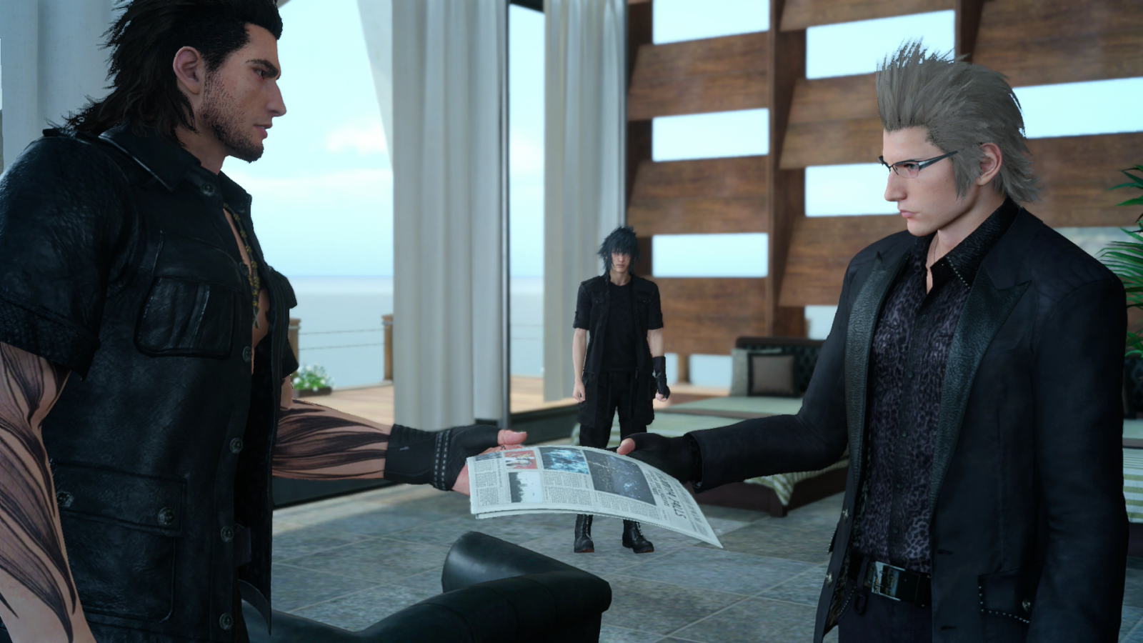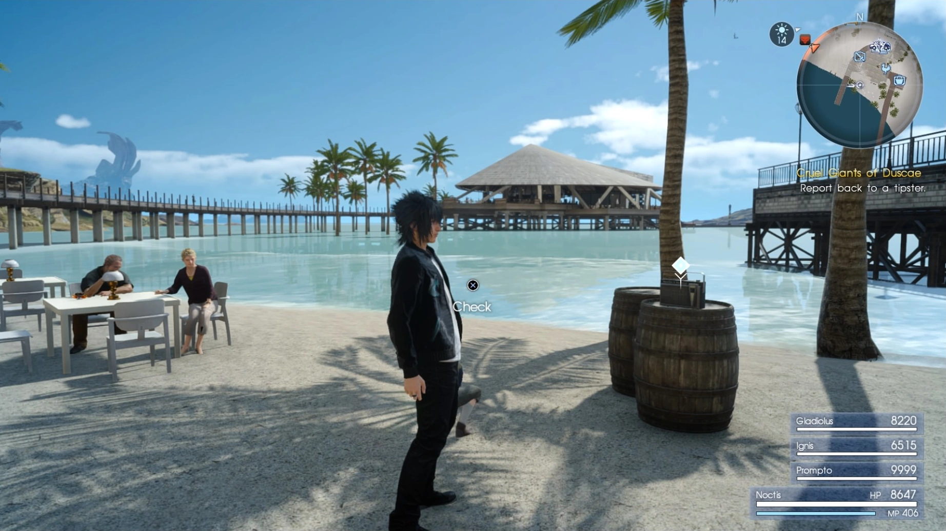 A reporter named Dino Ghiranze recognizes Noctis as the prince and offers to organize a ship if he does him a favor by bringing him a certain a gem. According to the Episode Carbuncle #10, Dino hangs out by the pier to catch the latest news and gossip from those traveling from Altissia, although the true reason may be so he can stay near Coctura Arlund, the chef of the renowned Mother of Pearl restaurant of the resort.[1] The party appeases Dino's request and stays at the hotel, but the morning papers bring grim news: Insomnia has fallen and been occupied by the empire. Disturbed, the party heads back to the Crown City.
