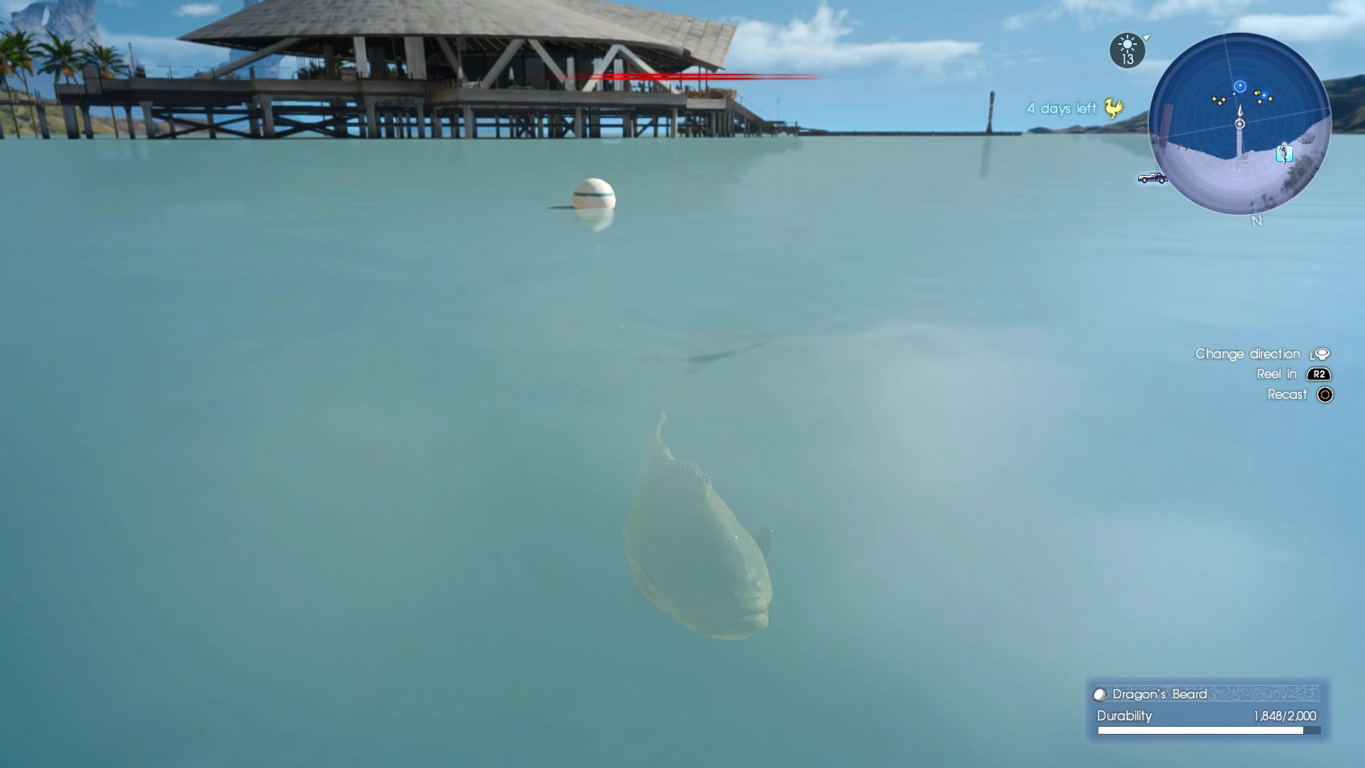 Suitable lures are the ones that sink, but an especially good fit is the Burrower: Abyss Worm. It will be a tough battle to reel in the fish, as it will struggle a lot (water is splashing and the controller vibrates). The player must not reel when the fish struggles, but there might only be short windows for reeling as the fish fights back most of the time. Tapping the reel button tends to work better than holding against fish that struggle a lot. Because the fish is so big, it wears down the line fast, and thus the player needs good technique and equipment to catch the fish.