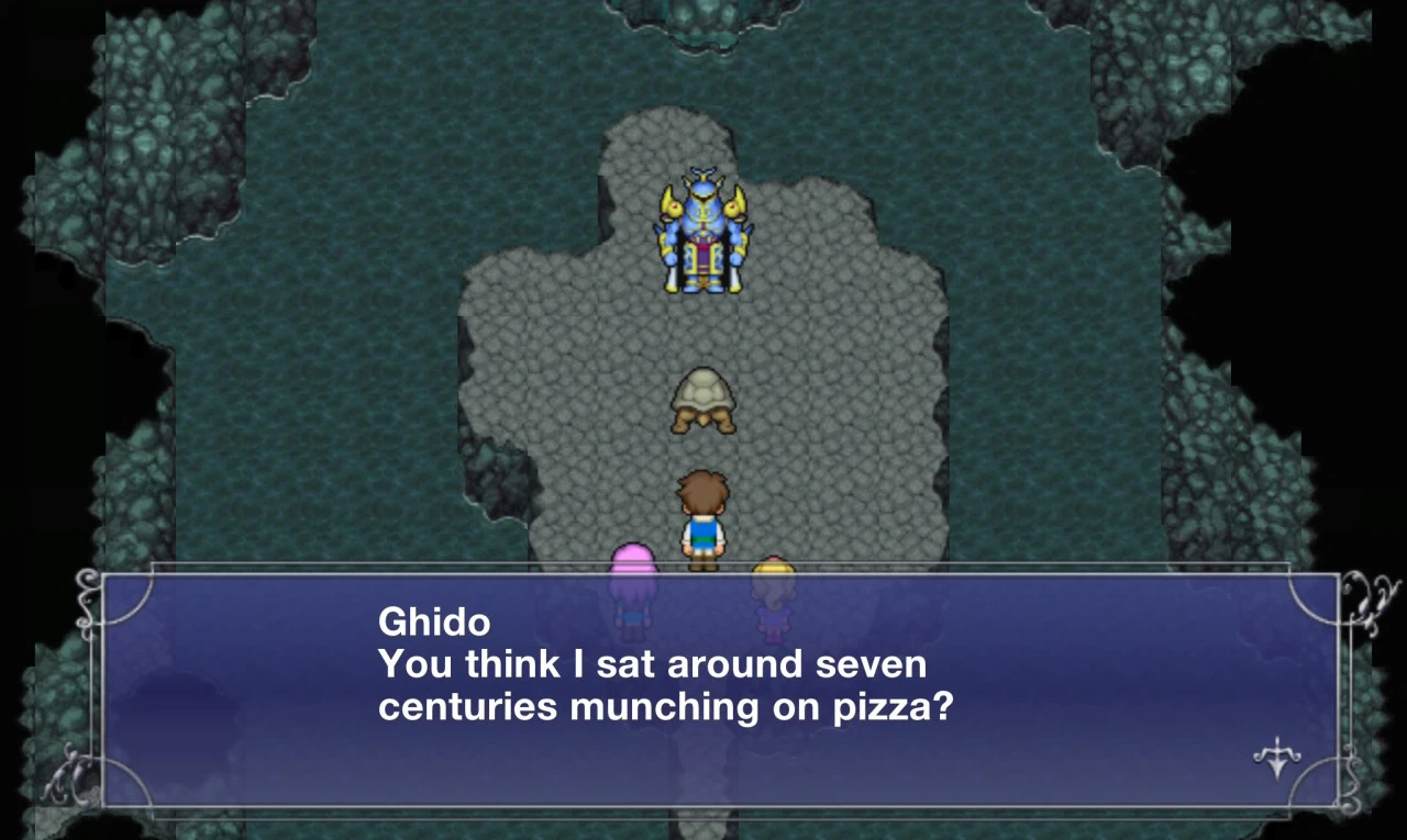The Light Warriors arrived after acquiring a submarine. When they met Ghido, Bartz Klauser poked Ghido and made fun of him, thinking him to be an ordinary turtle. Bartz, Lenna Charlotte Tycoon, and Faris Scherwiz were surprised to see Ghido respond and learn that he was a sentient turtle, while Galuf was embarassed. Ghido explained Exdeath's history and origins, and encouraged the warriors to travel to the Great Forest of Moore and intercept him.[4]