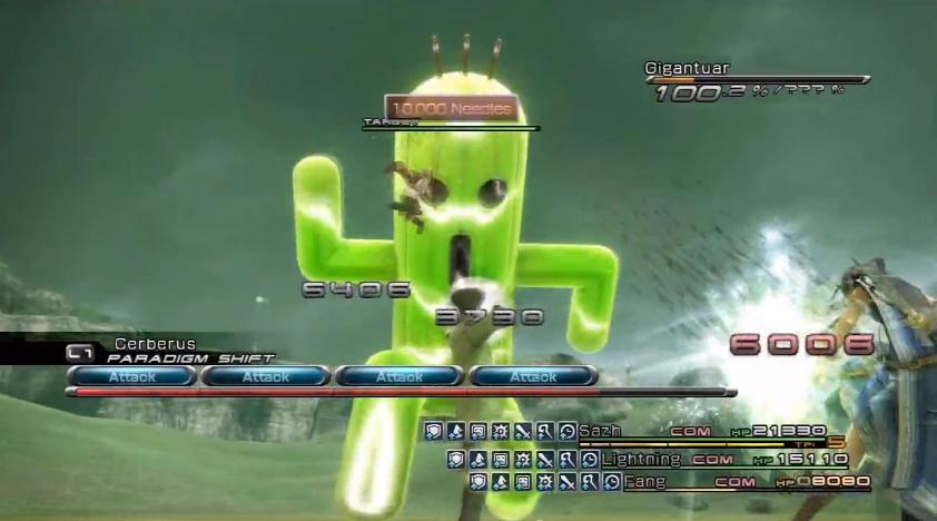 Snow might be a good choice of a Saboteur because of his liberal use of the Daze spell. Alternatively, the player may use Libra or a Librascope at the beginning of the battle so that the AI knows to only use Daze. Because Gigantuar has low HP, the Commandos can finish it off fairly quickly. If the party is still struggling, use of a Sentinel may help endure 10,000 Needles long enough to finish it off.