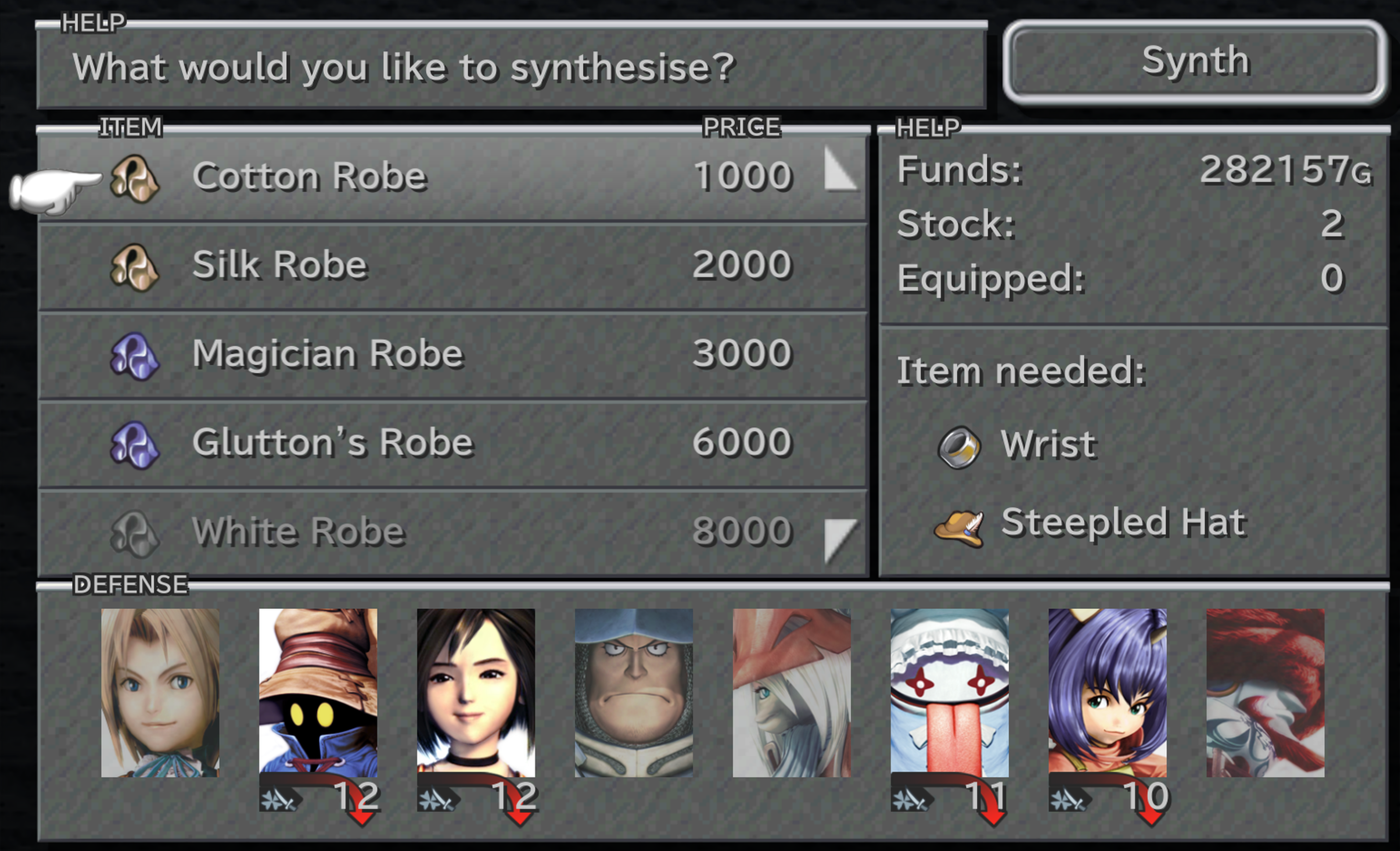 The first time visiting Dali, the player can buy Wrists for 130 gil each. Visiting Lindblum for the first time, the player can buy Steepled Hats for 260 gil each and synthesize the robes there, stocking up on hats afterward. Later, on the way to Treno as Dagger, the player can detour to Dali and buy Wrists and synthesize them into robes in Treno. Later still, the player can buy Steepled Hats in Black Mage Village, buy Wrists while getting the Burman Coffee during the Card Tournament (the player can leave Treno before doing the tournament and head for Dali), and synthesize the Cotton Robes in Treno. Towards the end of the game, the Black Mage Village changes its wares, with Steepled Hats no longer for sale. The player can still buy them from Atla's Mogshop in Burmecia.