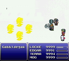 During the Battle for the Frozen Esper, if the player moves all three parties to the top-right corner of the battlefield quickly enough, one of the soldiers will receive a scrambled-up sprite that contains pieces of Terra's and Sabin's sprites. If the screen is made to fade out for any reason, including opening the Main Menu, switching parties, or the fade-out that occurs when a soldier reaches Banon, the soldier's sprite will return to normal.