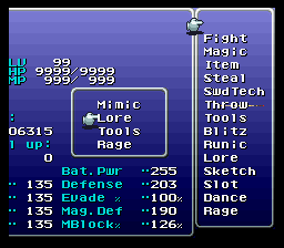 When the player tries to run during battle with a transformed Terra, she is not depicted as attempting to run even though she is fully capable of doing so and will briefly be shown running when she successfully escapes. Oddly, a frozen character will be given a running animation, even though they are unable to flee. This is another graphical bug that happens because while the game prevents zombified, petrified, KO'd, sleeping, and stopped characters from getting the run animation, it also counts Trance characters as among those ineligible for running, but not frozen ones. There is a bugfix patch that players can use to fix it on the SNES version.
