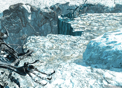 The canyon splitting the salt lake has large dinosaur bones on the side of the cliffs. In it, the monster Abadon hides in the depths of the old lake to challenge those who try to cross its flats. After following along the side of the canyon to the end, a dead end is reached.