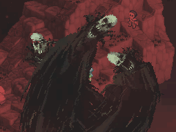 The Grim Reaper's appearance differs greatly from before, with its color scheme being black, red, and purple. It has a dark, mouth-less head and wears a horned skull. Its back has bat-like wings, and its red hands carry a darkened scythe. It is summoned using the spell Death and the command Doom.