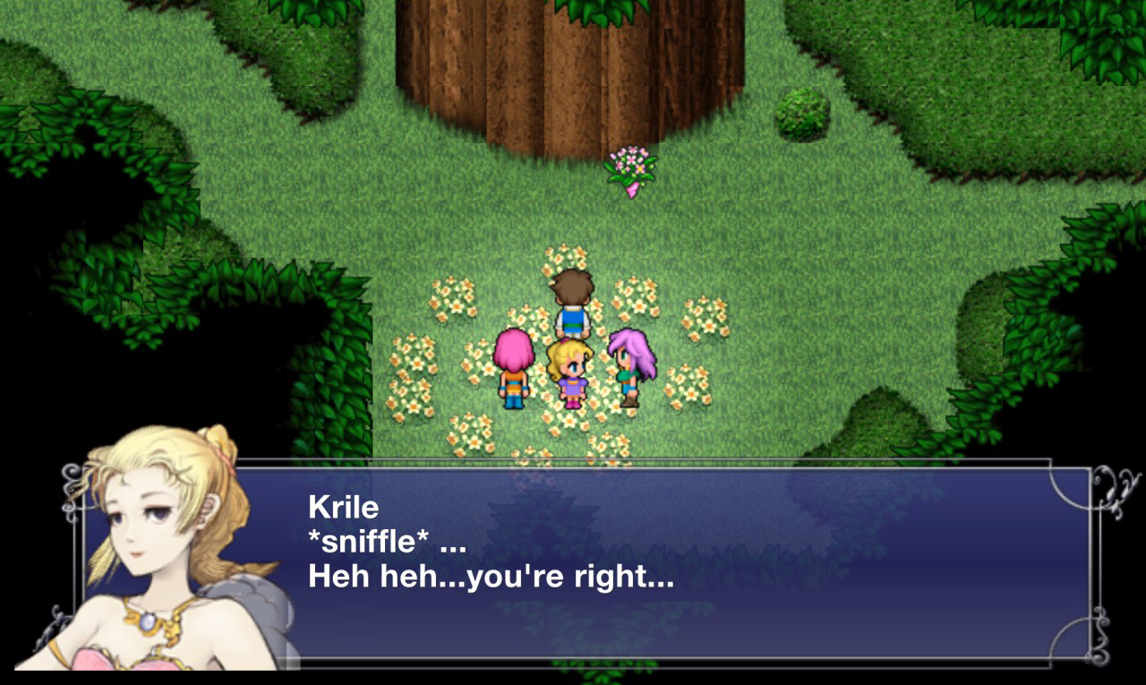 Krile Mayer Baldesion, tipped off by a moogle, arrived to their defense only to get attacked herself, forcing Galuf Halm Baldesion to fight Exdeath alone, expending the last of his life energy to protect her and the Light Warriors. Galuf passed away, but the Guardian Tree lended Galuf's spirit the strength to speak to Krile and pass on his abilities to her so she could take his place.[1]