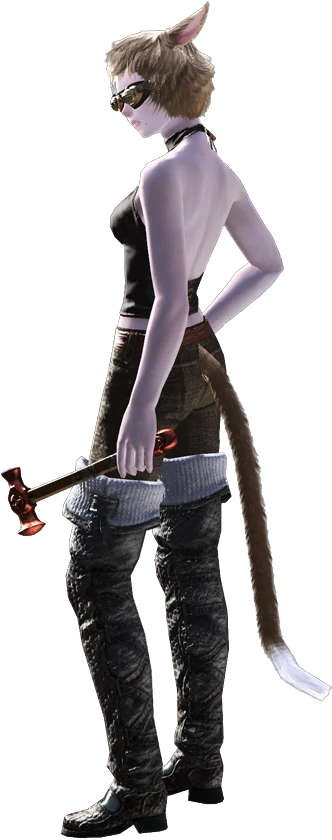 H'naanza is a Keeper of the Moon Miqo'te with pale skin and black hair. She wears a full Armorer's gown, slops, gloves, and workboots, with Ironworks Engineer's Goggles over her eyes.
