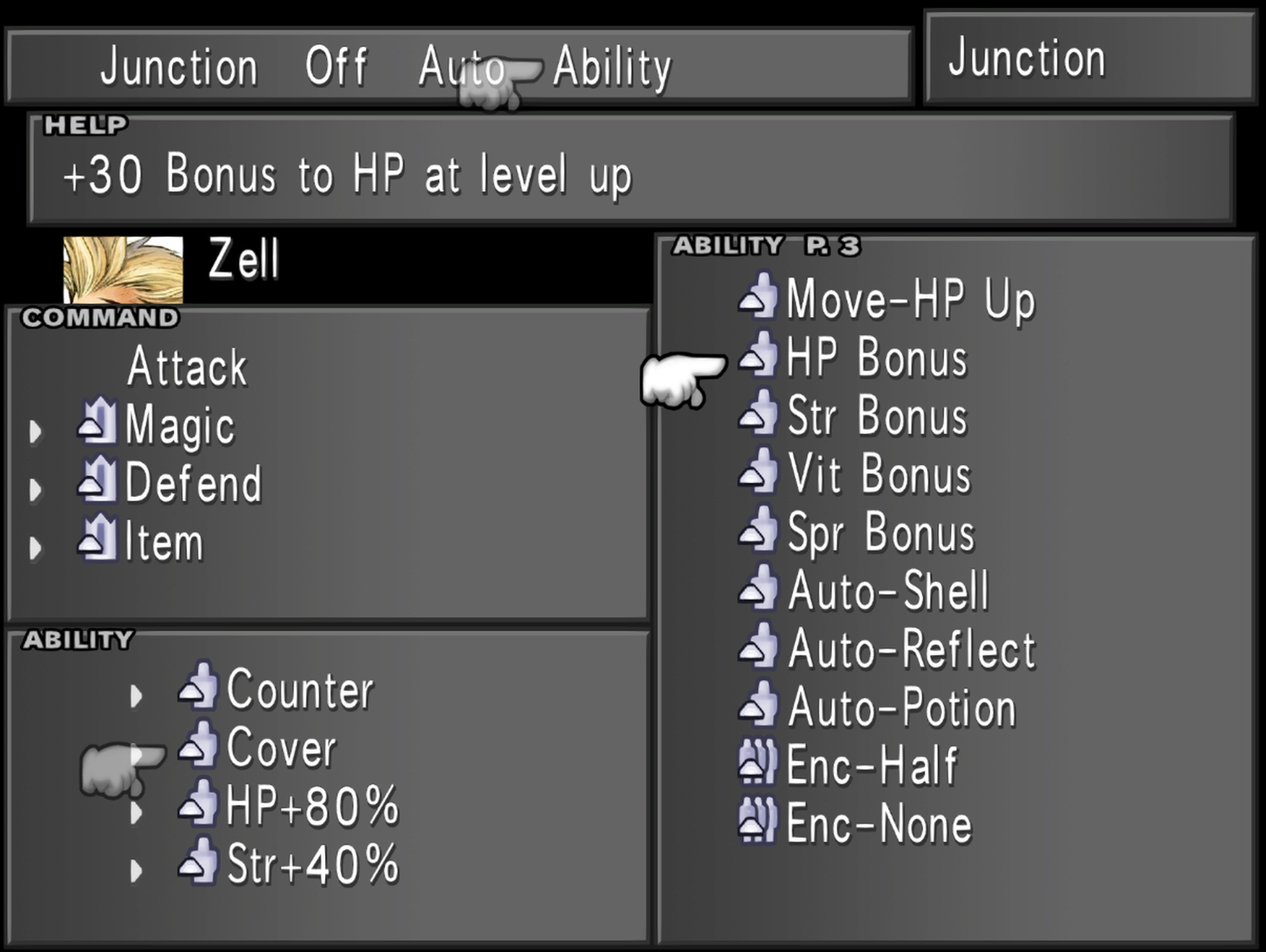 As a character can have maximum four support abilities in effect at once, the player cannot ever co-equip all Bonus abilities: HP Bonus is likely the one worth leaving on the wayside in favor of Str Bonus, Vit Bonus, Mag Bonus, and Spr Bonus. After getting all Bonus abilities, a fast leveling up place is on Island Closest to Hell where the player can quickly defeat enemies with Quistis's Degenerator and Death spells in ST-Atk-J even with a low level party. To avoid leveling up before the player has all Bonus abilities, the player can have KO'd party members, escape random encounters, equip Enc-None, and use Card and Petrify to defeat enemies.