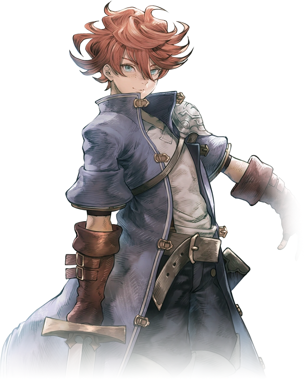 He is a young man with short red hair and blue eyes.