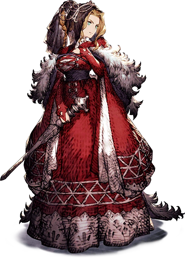 The queen of Leonis. With <<Fortem>> at her side, she faces Dorando and Gargas in battle and is thought to have lost her life there. Taking advantage of this, she returns to the persona of the Black-Robed Witch she was once feared as before her marriage to Oelde. She now takes her fight to the shadows with the aid of Rafale and Eliza.