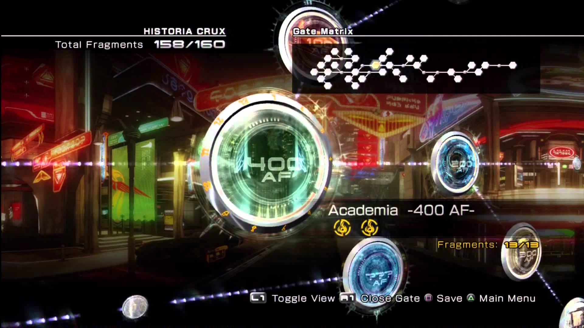 The date system is marked by the letters "AF", which stand for "After the Fall". Visitable years range from 3 to 700 AF. In each location and time, there are a certain number of fragments, with 160 in total, and the number of fragments the player has obtained from each area is displayed in the Historia Crux menu. Years containing X, such as 1X AF, indicate an alternate timeline created by solving paradoxes. There are also places marked with year unknown, such as "Serendipity -Year Unknown-".